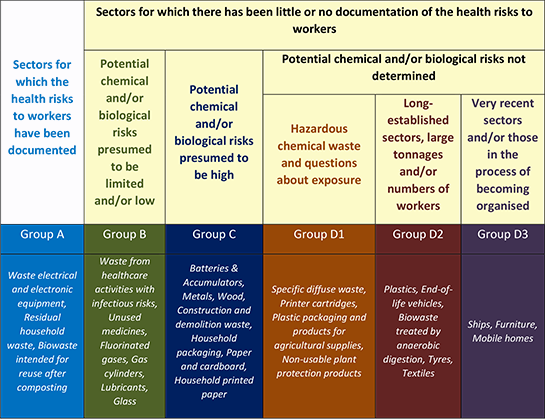 In order to identify and distinguish the sectors in terms of their impact on the health of professionals working in them, several criteria were studied: potential risks associated with the toxicity of chemicals, risks associated with the presence of bacteria or mould in waste; the level of documentation of these health risks; the quantities of waste produced, collected and treated within each sector; the number of workers involved in each sector's activities; and consideration of the economic and technical developments in the sectors over the coming years.