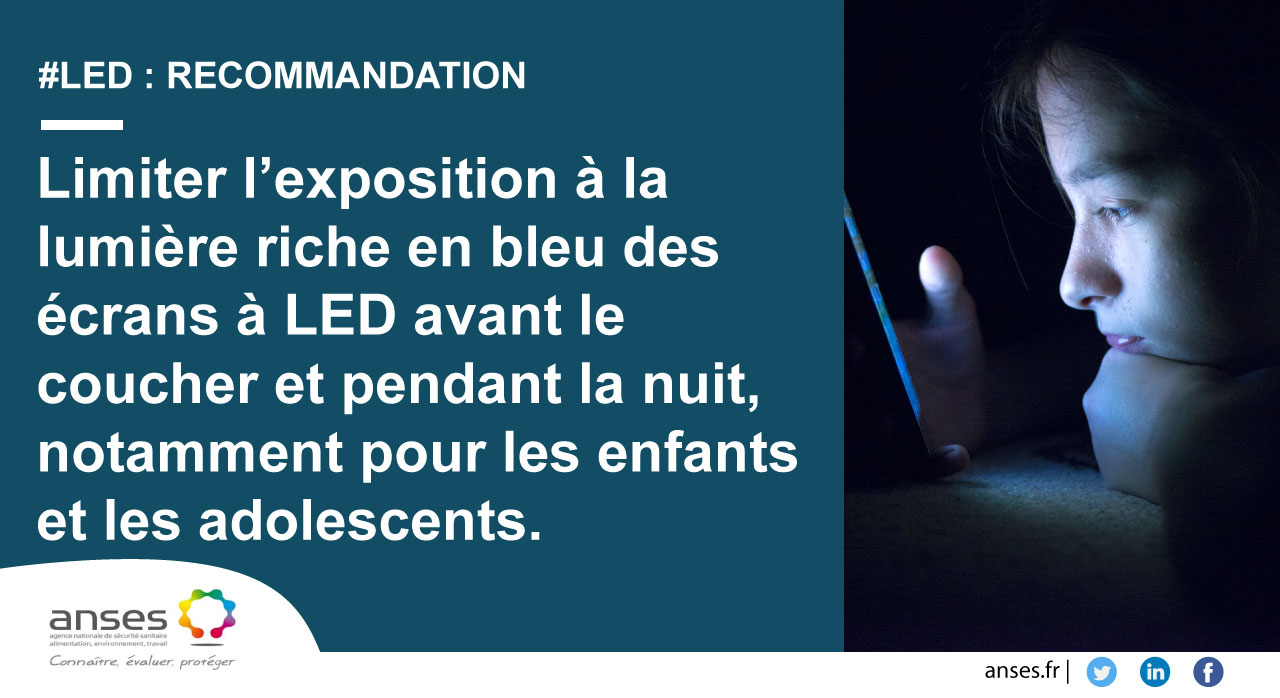 In addition, ANSES highlights disruptive effects to biological rhythms and sleep, linked to exposure to even very low levels of blue light in the evening or at night, particularly via screens. The Agency therefore recommends limiting population exposure to strong blue light before bedtime and at night, specifically children.
