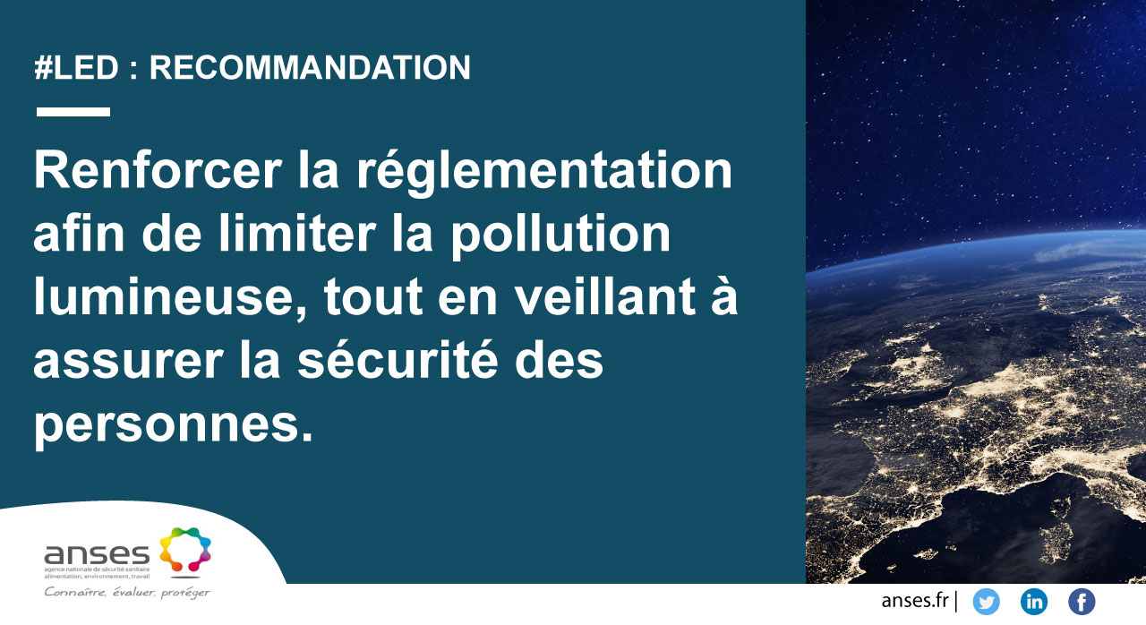 Finally, the Agency points to the harmful effects of lights at night on biodiversity and the environment. Regardless of the ecosystem studied, scientific knowledge has convergingly shown an increase in mortality and a decrease in the diversity of animal and plant species studied in environments illuminated at night, including by LED lighting. The Agency recommends that regulations be strengthened to limit light pollution, while ensuring the safety of individuals.