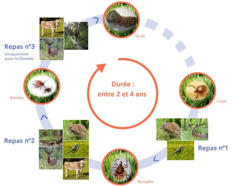 Le cycle de vie d’une tique est composé de 3 stades : larves, nymphes et adultes, chaque stade prenant un repas sanguin avant de se métamorphoser dans le stade suivant. Les femelles pondent des œufs dans la nature. De ces œufs vont émerger des larves. Ensuite, les larves vont piquer un petit animal vertébré (un petit rongeur ou un oiseau par exemple) et là, elles vont prendre leur premier repas de sang.